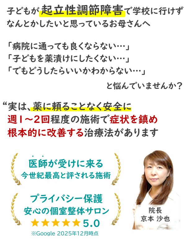 「3カ所の痛み消滅テスト」でふくらはぎ、首、肩の痛みが取れた場合、背骨の歪みが整い、起立性調節障害の原因となる自律神経の乱れも改善されたことになります。