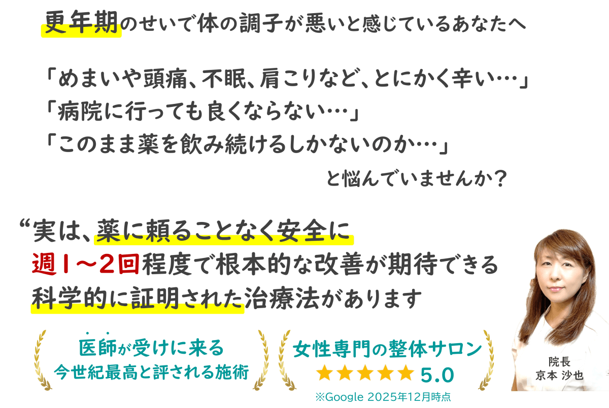 その場では身体の変化を実感できなくても、更年期障害の原因となる交感神経の暴走が止まっているので、2~3日もすれば体調が良くなってきます。