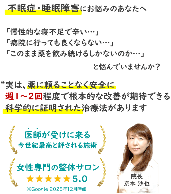 その場では身体の変化を実感できなくても、不眠症の原因となる交感神経の暴走が止まっているので、2~3日もすれば眠れるようになってきます。