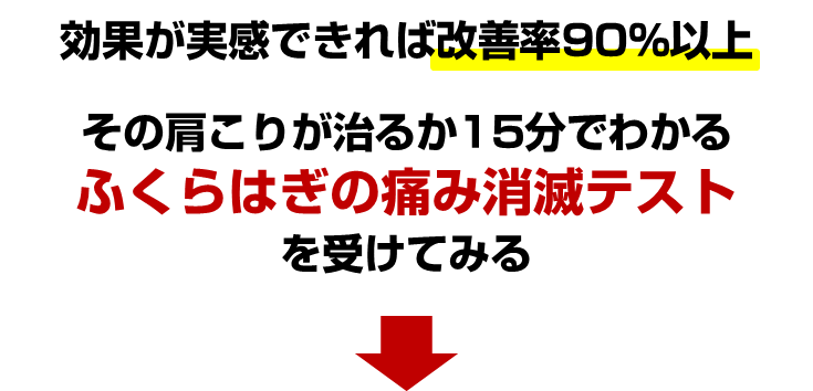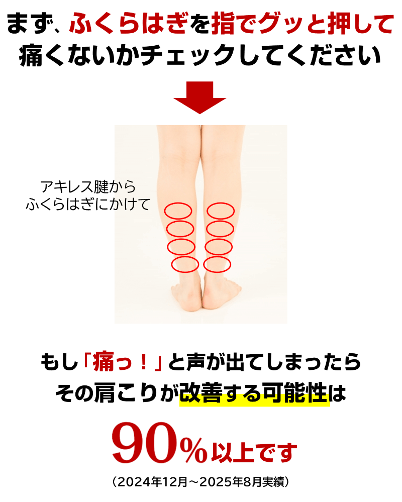 これまでの実績では「ふくらはぎの痛み」が取れた方の90%以上が辛い肩こりから解放されました。