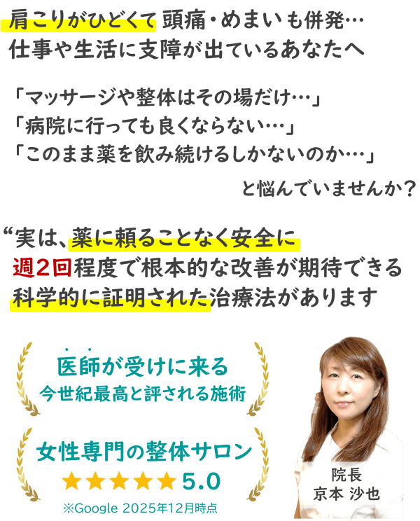 このように、どんなにひどい肩こりとそこからくる頭痛・めまいであっても、根本的な原因が背骨の歪みであれば、たった数回の施術で改善に向かいます。