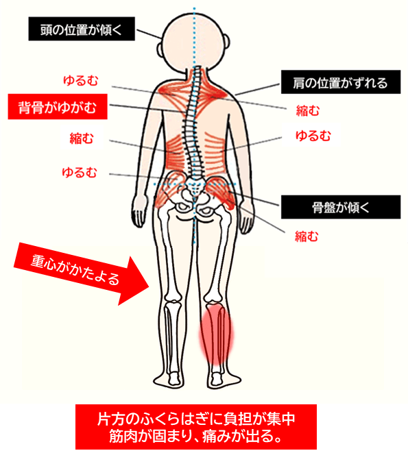 背骨が歪むと重心がずれて、左右の脚にかかる体重のバランスが崩れます。